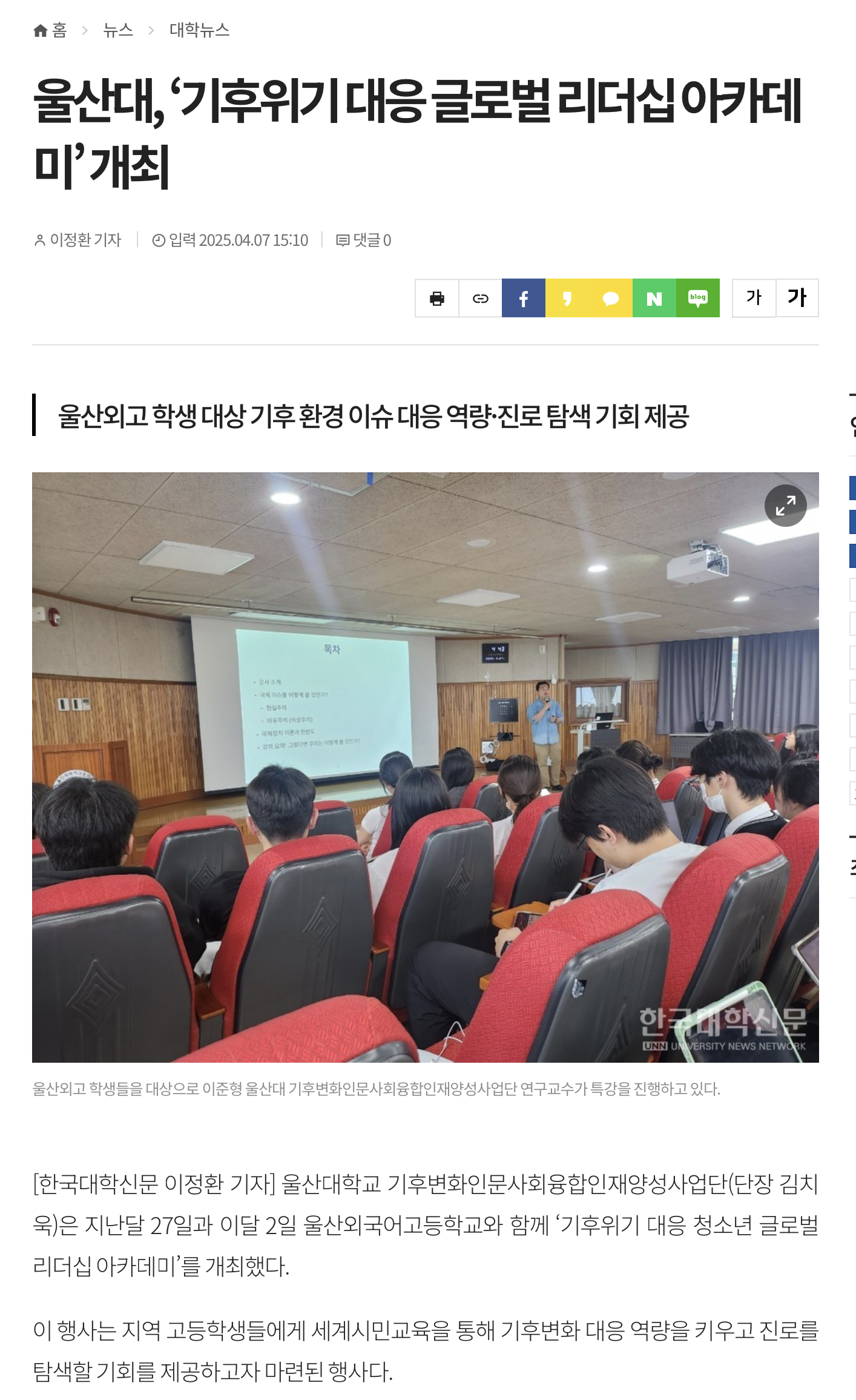 [한국대학뉴스] 울산대, ‘기후위기 대응 글로벌 리더십 아카데미’ 개최