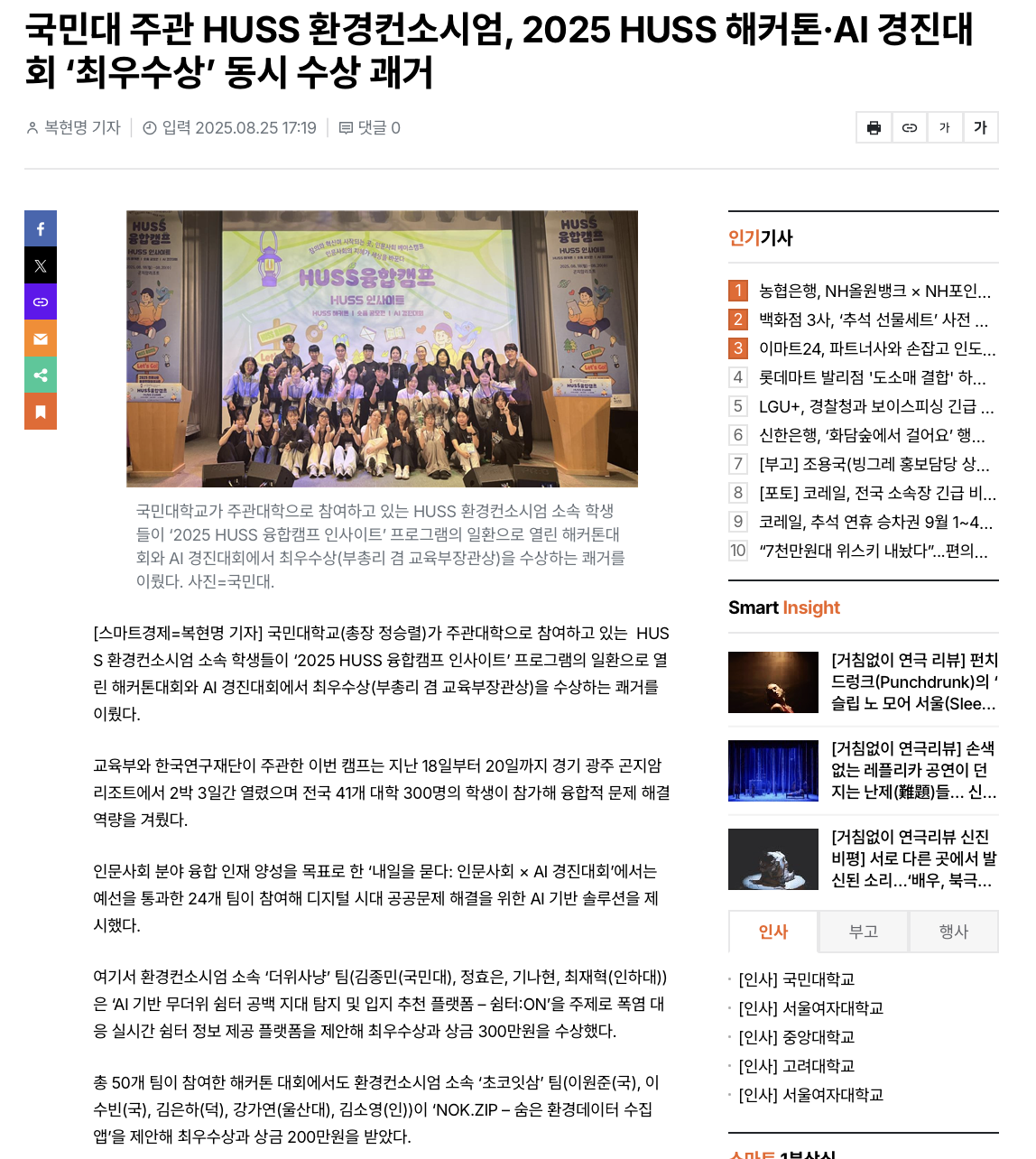 국민대 주관 HUSS 환경컨소시엄, 2025 HUSS 해커톤·AI 경진대회 ‘최우수상’ 동시 수상 괘거 링크: https://www.dailysmart.co.kr/news/articleView.html?idxno=112270 |