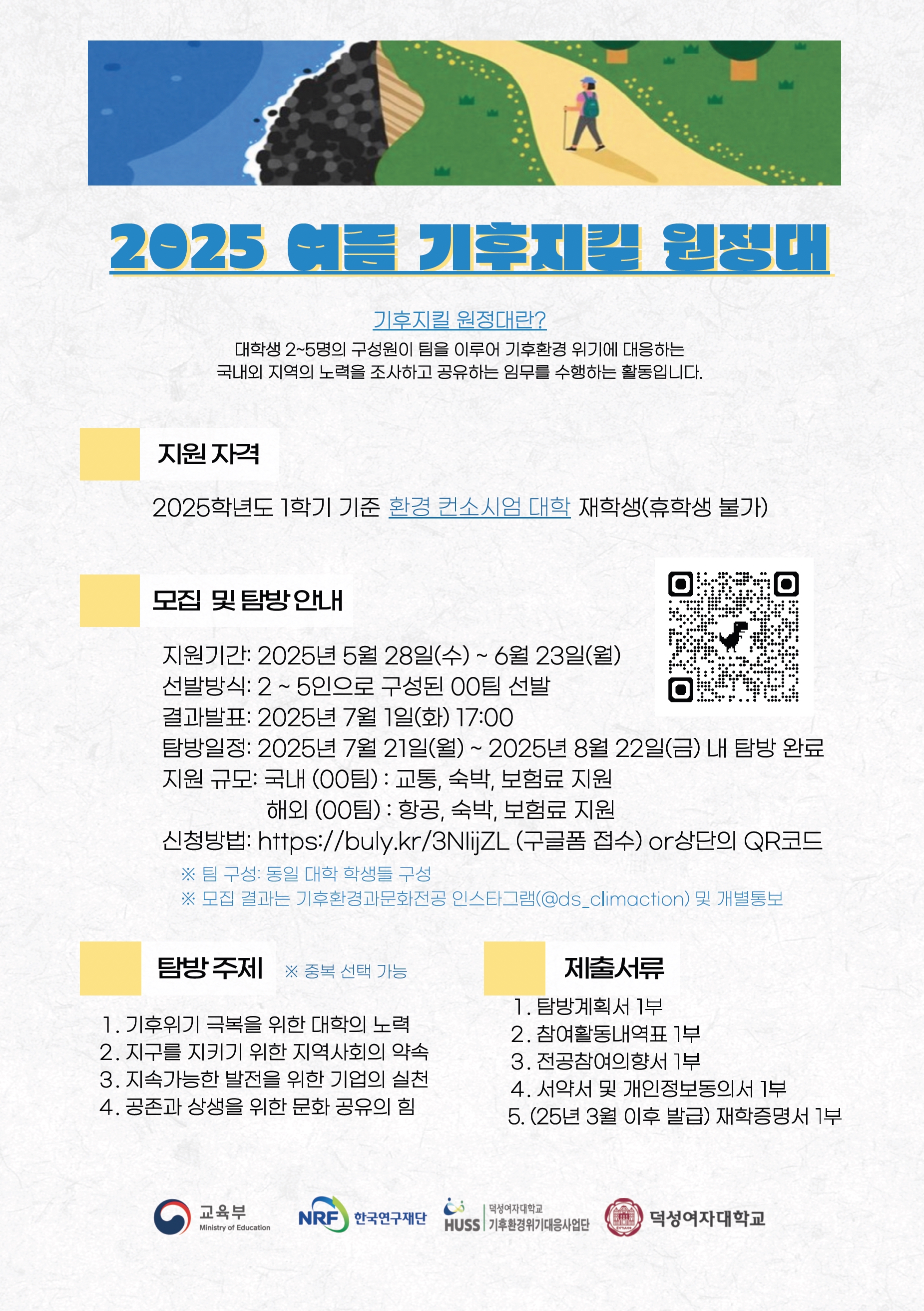 [행사안내] 덕성여자대학교 「2025 여름 기후지킬 원정대」 모집 안내 (국내탐방 전용) | |||||