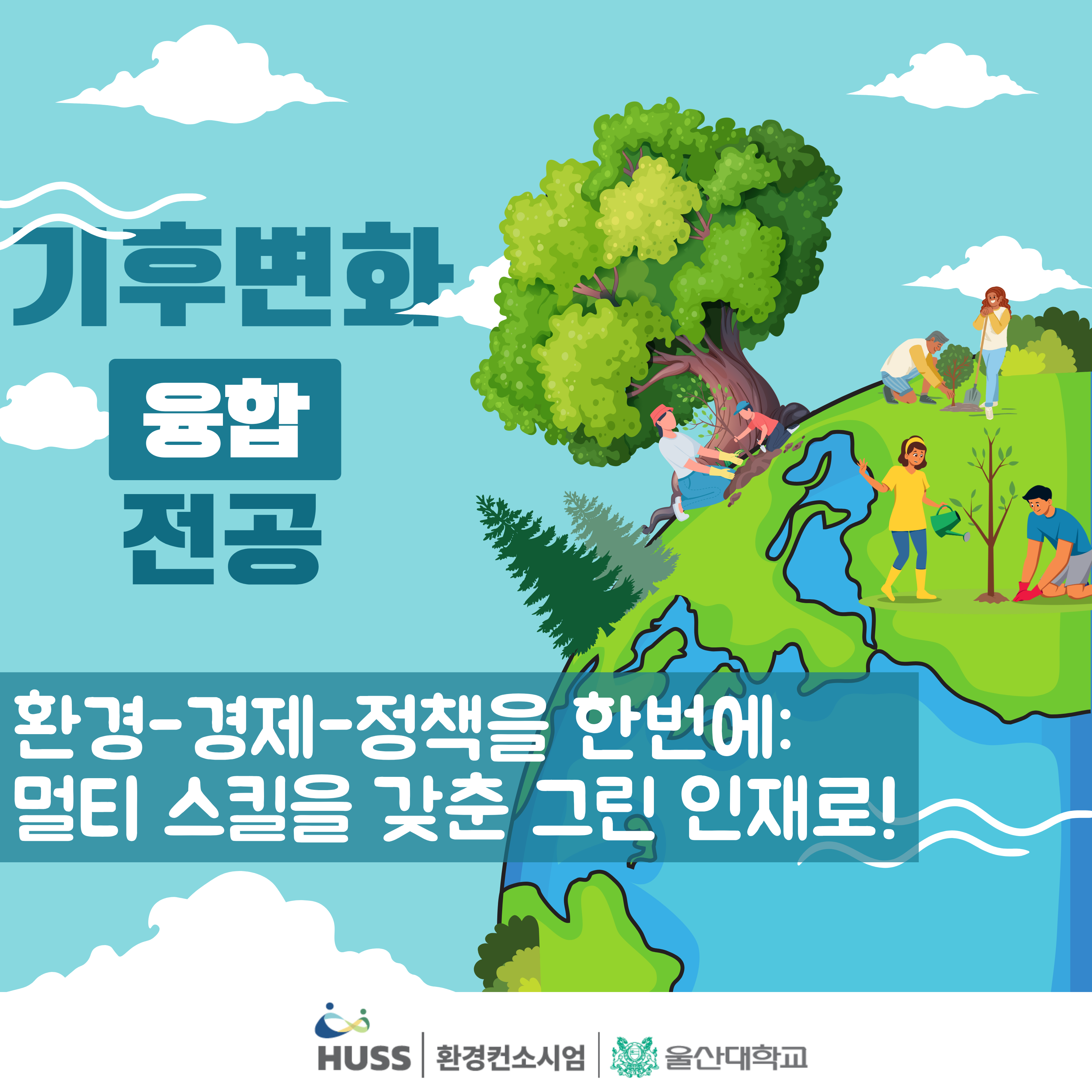 울산대학교 기후변화 인문사회융합인재양성사업단은 기후‧에너지 전환 시대를 선도할 ‘기후변화 융합전공’을 개설하고 재학생 여러분을 초대합니다.