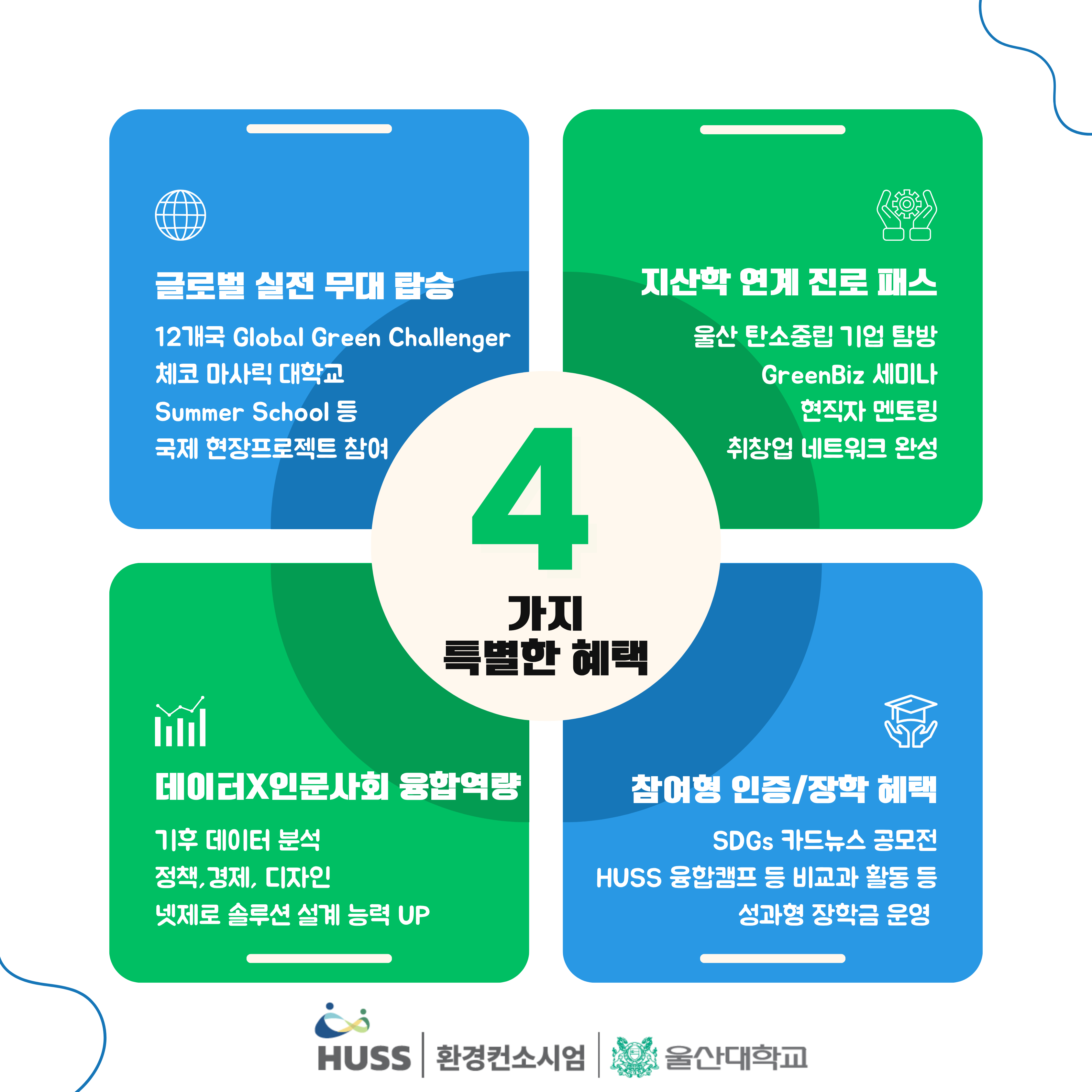 사회과학·인문학의 관점으로 기후위기대응의 최전선에 앞장설 인재양성을 목표로, 다음과 같은 4가지 특별 혜택을 약속드립니다.