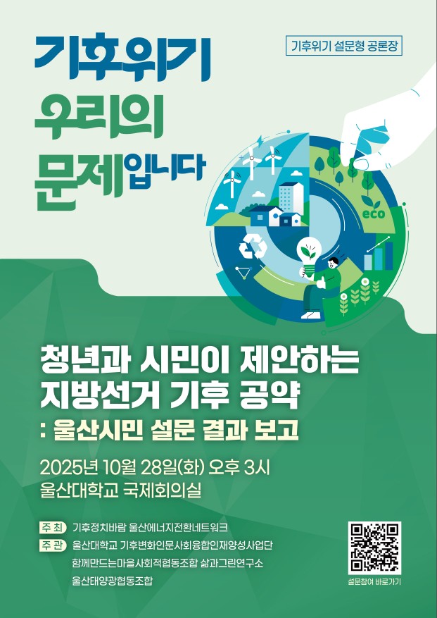 <기후위기 설문형 공론장> 기후위기 우리의 문제입니다. 세대별 기후위기 체감 및 정책발굴의 장에 여러분을 초대합니다. 일 시 : 2025년 10월 28일(화) 오후3시 장 소 : 울산대학교 국제회의실 세부프로그램 발제 : 기후위기 관련 설문발표 김민경 소장(삶과그린연구소) 좌장 : 이준형 교수(울산대학교) 토론 : 김형근 대표(정책과비전포럼 대표, 해상풍력과 기후위기, 기본소득) 김예원 사무국장(울산불교환경연대, 우리가 울산대앞에서 캠페인을 하는 이유) 김단비(청사진:청년사회복지사의진심 대표, 기후위기와 복지는 맞닿아 있다). * 세미나 사전설문 https://forms.gle/exVyZVhAMg1QCXtx9 주최 : 기후정치바람 울산에너지전환네트워크 주관 : 울산대학교 기후변화인문사회융합인재양성사업단, 함께만드는마을사회적협동조합 삶과그린연구소, 울산태양광협동조합 |